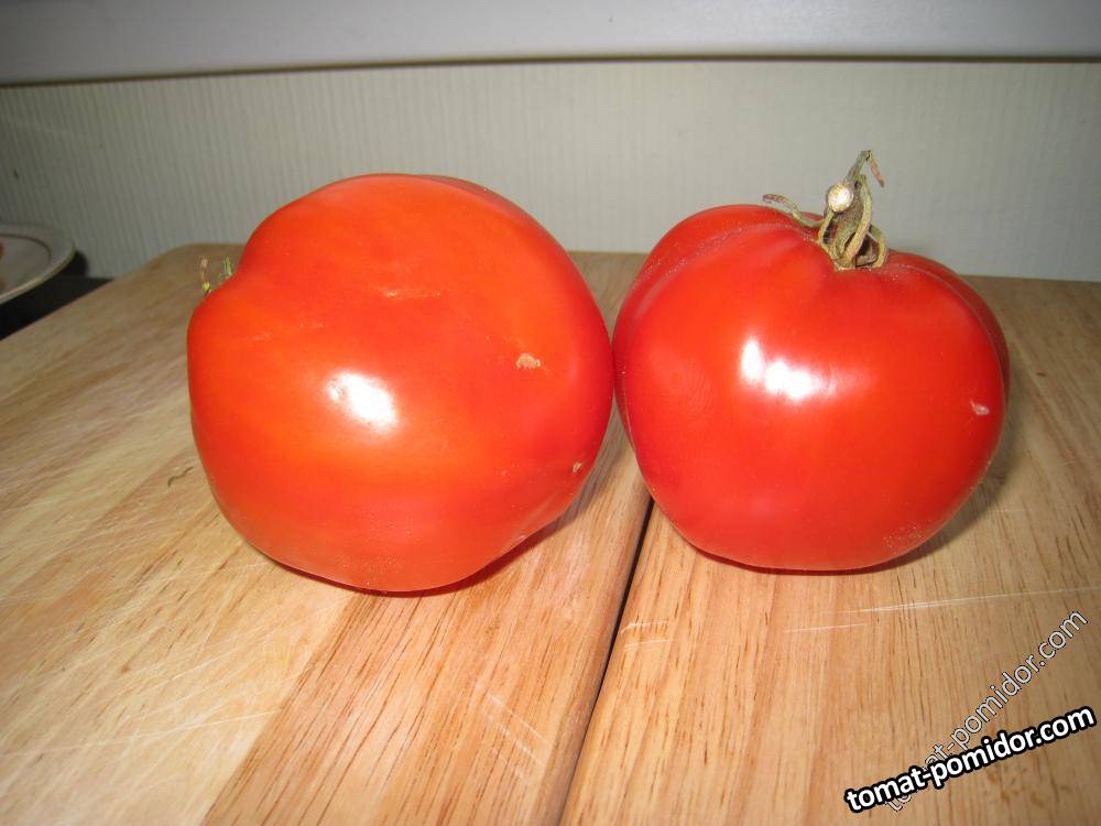 Сорт среднеранний, из крупноплодных томатов поспевает одним из первых. Куст высотой 70–80 см, детер., не склонный к образованию пасынков, что облегчает уход за растениями. Плоды очень красивые, усечено- или округло-сердцевидные, некоторые слаборебристые, насыщенно-розовые с муаровым отливом, необычайно мясистые, с тонкой, легко снимающейся кожицей, массой 400–600 г, нередки плоды весом 1 кг и более. Мякоть сочная, нежная, “тающая”, сахаристая, без кислинки, исключительно вкусная и ароматная, с небольшими семенными камерами. Урожайность до 5–6 кг с куста. Сорт устойчив к болезням, перепадам температур и влажности. Один из лучших отечественных сортов. Для потребления в свежем виде и приготовления соков, соусов.