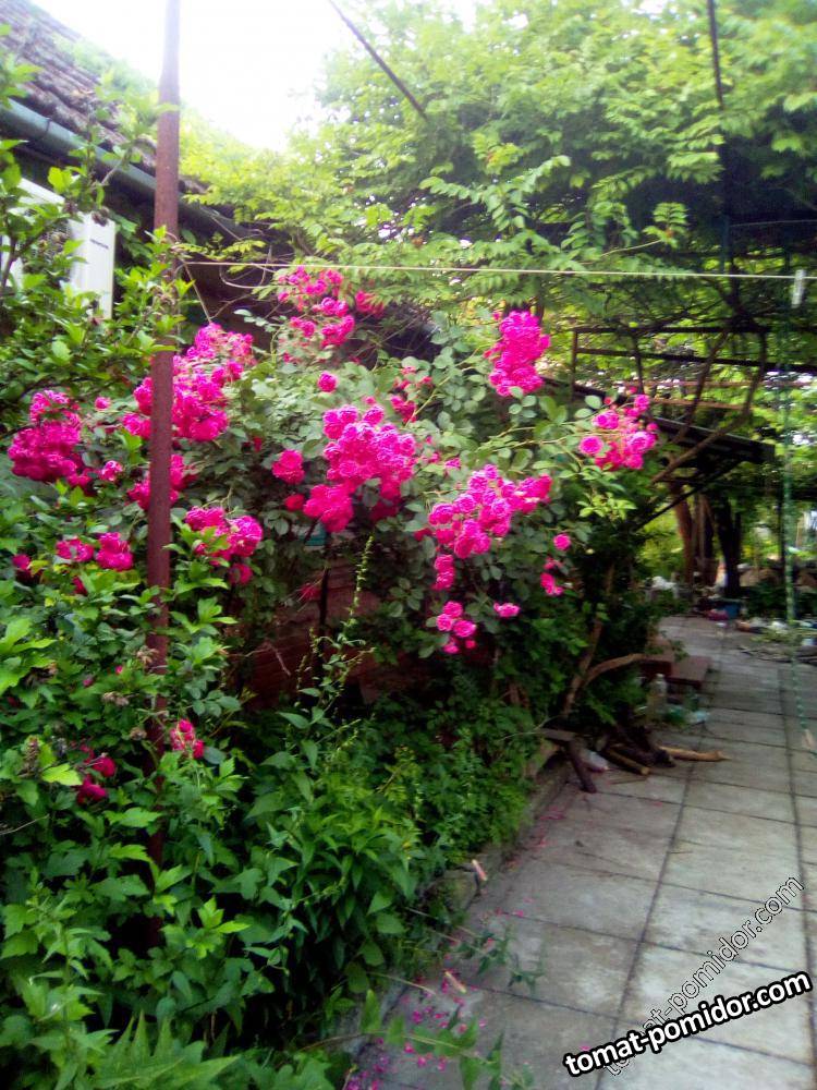 Кампсис и вьющая роза летом