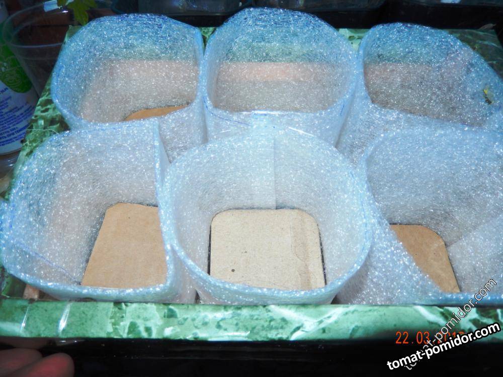 Коробка сделана из пенопласта. Цилиндры из подложки соединены скотчем, по размеру коробки, что бы не было пустот при заполнении грунтом. У меня получилось 6-6/9 см. Донышко плотно из толстого гофрированного картона с подрезанными углами. В теплице и на окне, легче сохранить тепло, за счет плотности между стенками. В горшках и стаканчиках остывать или перегреваться будет сильнее.