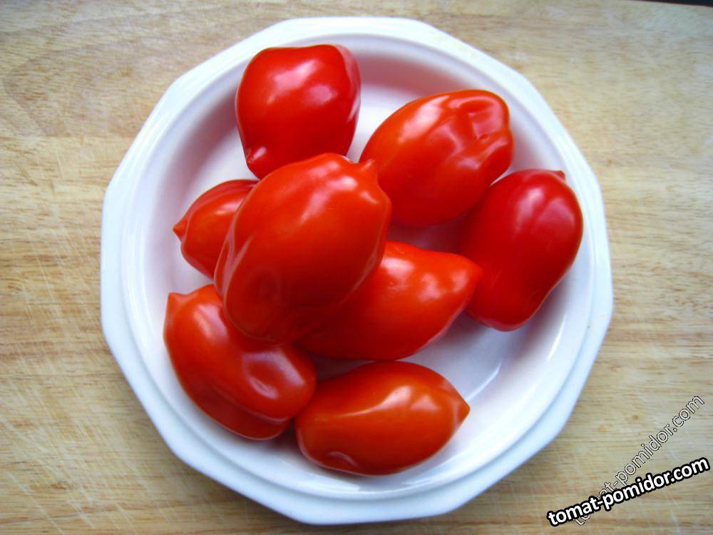 Сорт супер ранний, высотой 0,9–1,0 м. Детер. Пасынков образует умеренное количество. Плоды вытянутые, бочковидные или грушевидные, слегка ребристые, длиной до 10–12 см, ярко-красные, массой 120–150 г, собраны в длинные кисти по 5–7 шт. Стенки плода толстые, мясистые. Мякоть плотная, содержит минимальное количество сока. Сорт высокоурожайный, устойчивый к болезням, хорошо переносит перепады температур. Плоды прекрасно дозариваются и хранятся длительное время, они редко используются в свежем виде, а идеальны для замораживания и вяления, приготовления соков и соусов.