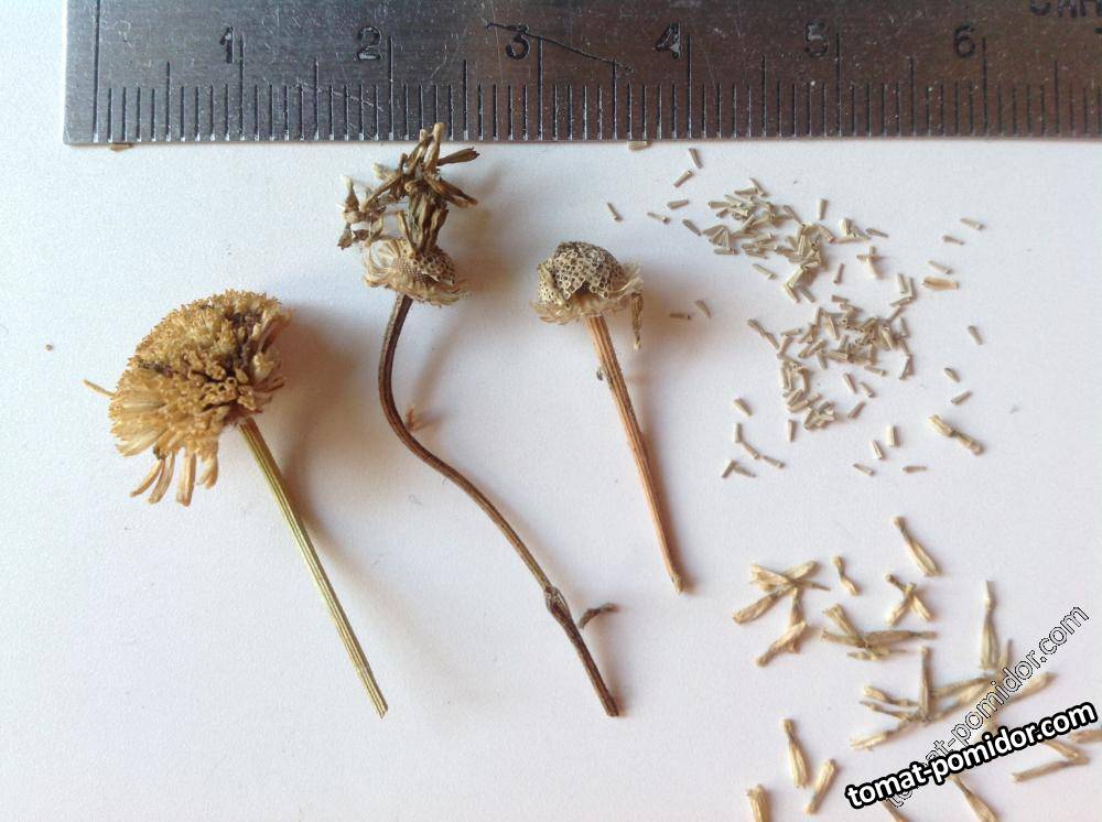 Слева направо: соцветие матрикарии, семена с хохолком остатков трубчатых цветков, корзинка семян без трубчатых цветков, семена, чуть ниже трубчатые цветки. Очень часто путают семена и трубчатые цветки.