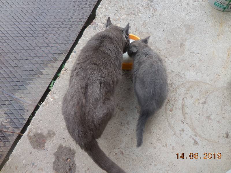 Семейная идиллия: наш кот со своим сыночком от соседской кошечки. Дружненько лакают, щека к щеке...