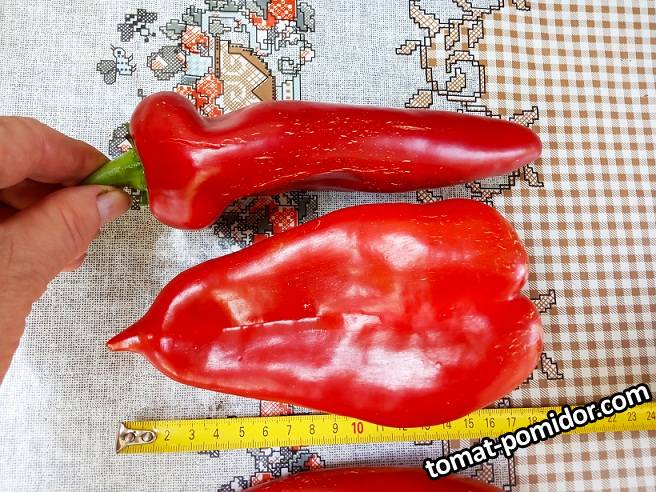 Перец сладкий,куплен на рынке для семян.очень интересная форма у плодов,у хвостика четырёхгранник,далее плод сплюснут с двух сторон,в профиль узкий,а в фас похож на вытянутое сердце с носиком.Толстостенный ,сочный,очень вкусный,без кислинки и терпкости.Кожица на плодах тонкая,нежная.