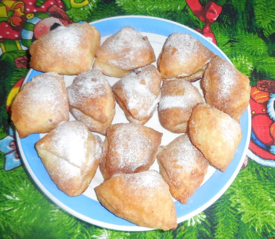 Тесто: 1 пачка творога, 1 пачка маргарина ( я делаю со сливочным маслом 50/50), 2 неполных стакана муки, соль, ванилин (по вкусу). Замесить и вынести на холод. Пока тесто охлаждается, приготовить начинку: мелко порезать 2-3 яблока. Тесто разделить на небольшие шарики, раскатать лепёшечками. На край лепёшки положить измельчённые яблоки, посыпать сахаром и сложить лепёшку сначала пополам, потом ещё раз пополам - получается треугольничек с начинкой на нижнем слое теста. Чтобы сок во время выпечки не вытекал, края треугольничка слегка защипать. Выложить на лист и выпекать в духовке до зарумянивания.В горячем виде выложить на блюдо и обсыпать сахарной пудрой.