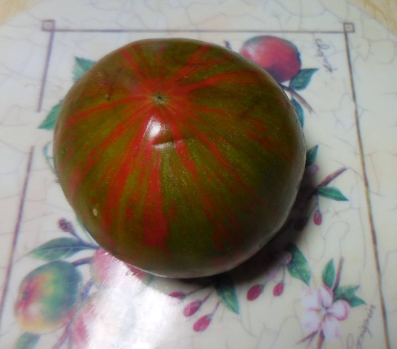 Индетерминантный, кистевой, среднего срока созревания.  Лист обычный. Плоды среднего размера, коричневые с зелеными  штрихами и полосами, вкусные и красивые, салатного типа. В теплице куст был высотой под 2 метра.