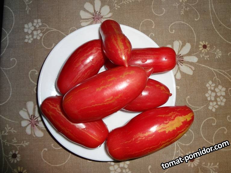 Создан и отобран с классического Сан-Марцано. Ранний, куст 1,0 м в ОГ, плоды красные в желтую полоску, перцевидные, массой  до150 гр. Сорт с высокой устойчивостью к грибковым болезням. Отлично подходит для консервирования и приготовления соуса. Мякоть толстая, плотная, очень ароматная.