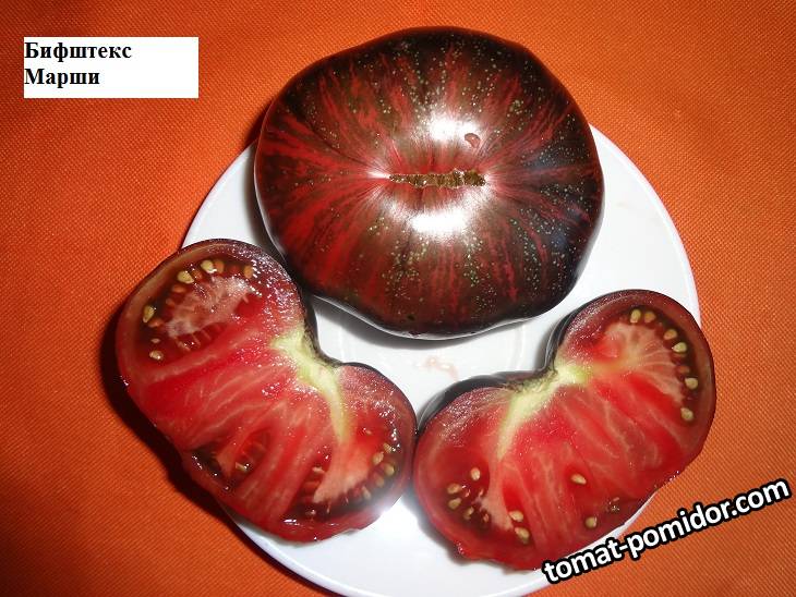 CUCSA 11607 Опубликовано 21 августа, 2020 Бифштекс Марши, Звездный истребитель Марши плоскоокруглый (Marsha,s Starfighter Beefsteak) Новый сорт от Marsha Eisenberg. Очень красивый томат типа бифштекс, мясистая, сочная мякоть, вкус с хорошей сладостью, но и уравновешенной кислинкой. Имеет красивую окраску тёмно красных тонов с зелёными и серебристыми полосами, по плечам антоциан. Вес 250 гр. в среднем, очень урожайный сорт. Ссылка на комментарий