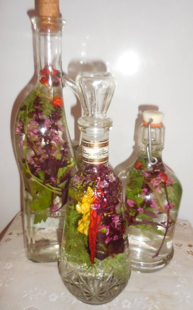 Новая версия пряного уксуса. На этот раз кинула в бутылки веточки базилика, зелёного укропа, петрушки и желтые бархатцы. Остальные пряности - как обычно: перец горошком, душистый, острый (стручок), гвоздика, лаврушка.