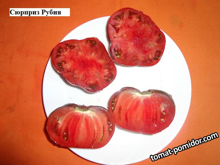 CUCSA 11606 Опубликовано 5 октября, 2020 Сюрприз Рубия, Рубиновый сюрприз (Ruby Surprise) Индет., среднеспелый. Устойчив к болезням. Высота 1,6 м. В кисти по 3-4 плода. Вязал без пропусков. Плоды крупные плоско округлые, с гладкой кожурой, очень красивые тёмно-красные (рубиновые) плоды, 300-500 гр. Мякоть при созревании приобретает цвет от светло розового до глубокого рубинового. Плоды плотные, мясистые и в то же время очень сочные, ароматные, с идеально сбалансированным вкусом. 1 Ссылка на комментарий