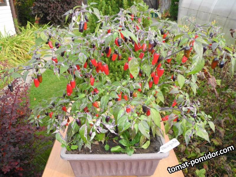 Пестролистный сорт перца, самый декоративный. В окраске листвы присутствуют оттенки зеленого, фиолетового и белого. Плод небольшой, до 2 см в длину в технической зрелости шоколадного цвета, в дальнейшем перецветает в алый. Острота средняя до 30 000 SHU. Период вегетации до биологической зрелости 110–120 дней. Хорошо растет в горшках. При высадке на рассаду в январе один куст за сезон может дать до 300 стручков при правильной агротехнике. Можно использовать в декоративных целях, для украшения беседок, террас и патио (описание и семена с Чесночной фермы).