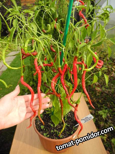 Svetikk 53566 Опубликовано 15 октября, 2020 Острый перец Thunder Mountain Longhorn C. Annuum Знаменитый сорт острого перца. Является рекордсменом по длине плодов, которые могут вырастать до 50 см. По традиции сорта культур нельзя переводить, но самое близкое значение перевода это Молниеносный Горный Длиннорог. Растение высокое, до 1, 7 метра, активно ветвится. Очень продуктивный сорт. При правильной агротехнике с одного растения можно получить до 100 стручков. Острота до 50 000 сковиллов, аромат очень интенсивный, вкус без горечи и кислоты. Для свежего употребления и сушки. Высушенные стручки можно использовать для украшения интерьера. Семена и описание с Чесночной фермы. У меня рос в небольшом горшке около 5л, все хотела пересадить в объем побольше, да так руки и не дошли. Поэтому рост куста был около 60см, макс. длина стручка около 25см. Очень декоративно смотрится, хочу повторить в объеме побольше. 1 Ссылка на комментарий