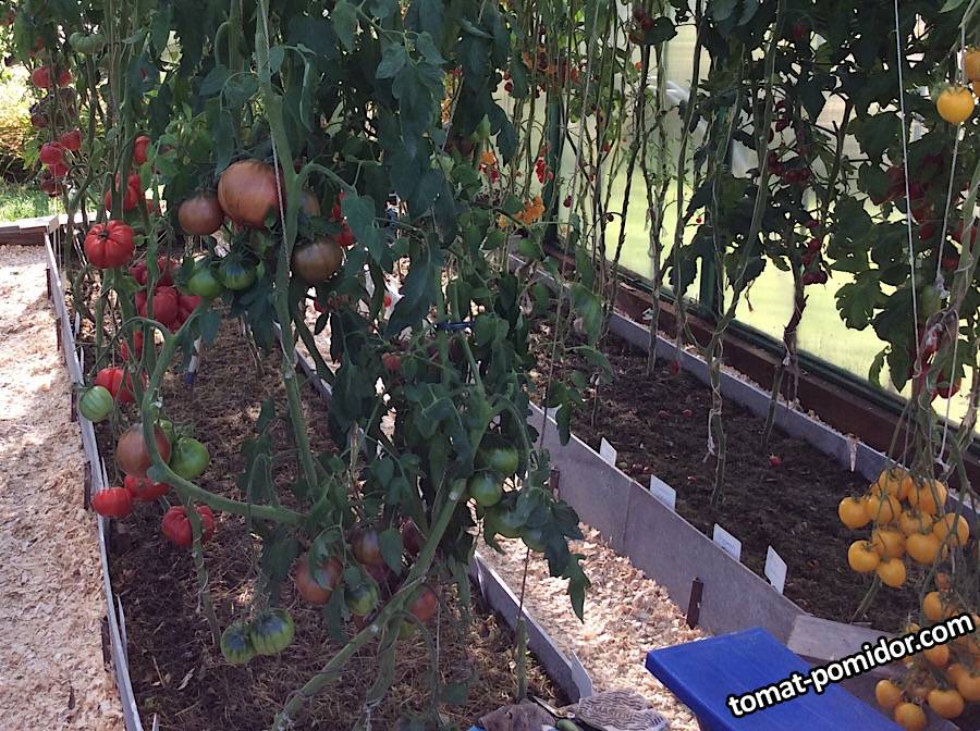 Левая грядка Мармеладная лампочка, за ней красные Винный болгарский Великан;справа желтые Анна Герман