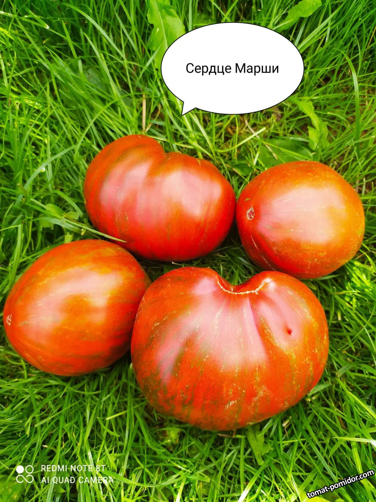 Marsha's Starfighter Heart (Сердце Марши). Одна из линий Проекта Звёздных войн, которую ведёт Марша Айзенберг (Южная Флорида). Поэтому, этот вариант так и назвали - Сердце Марши.Высокие, сильные, с пониклой листвой, в теплице высота была до 2 м и более. Очень продуктивные растения, образуют кисти по 6-7 удлинённо-сердцевидных плодов. На плодах чётко проступает "художественная роспись" в виде фигурных линий, на вершине плодов наблюдается слабое проявление antho. Плоды на растениях могут быть разной формы - от пухлых, округлых сердцевидных, до более удлинённых с характерным носиком. Но все с плотной , сочной мякотью сладко-терпкого вкуса.