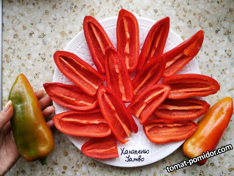 Действительно, мощный и урожайный куст, в ОГ до 70см, плоды в 3-4 раза крупнее классических халапеньо и без характерных трещинок. Стенки толстые, до 5мм, острота красных плодов от слабой до средней. Сорт очень понравился!