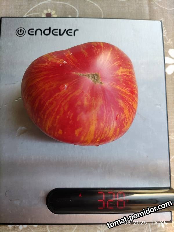 Ранний, высокорослый, инд. сорт. Интенсивный рост. Малиновые с желтыми штрихами плоды 300-500 гр. в форме широкого сердца, мясистые, сладкие, очень вкусные и ароматные. В период налива имеют зеленые штрихи по всему плоду, которые по мере созревания становятся желтыми и практически исчезают, когда плод поспеет. Урожайный. Семейный сорт.