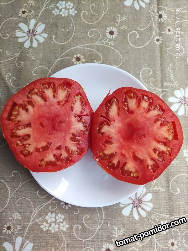 Индет. Высокорослый, урожайный, среднеспелый сорт. Плоды крупные, плотные, остроносые или широкие сердца, красного цвета с глянцем, массой 300-400 гр. Мякоть малинового цвета, маслянистая, необыкновенно вкусная.