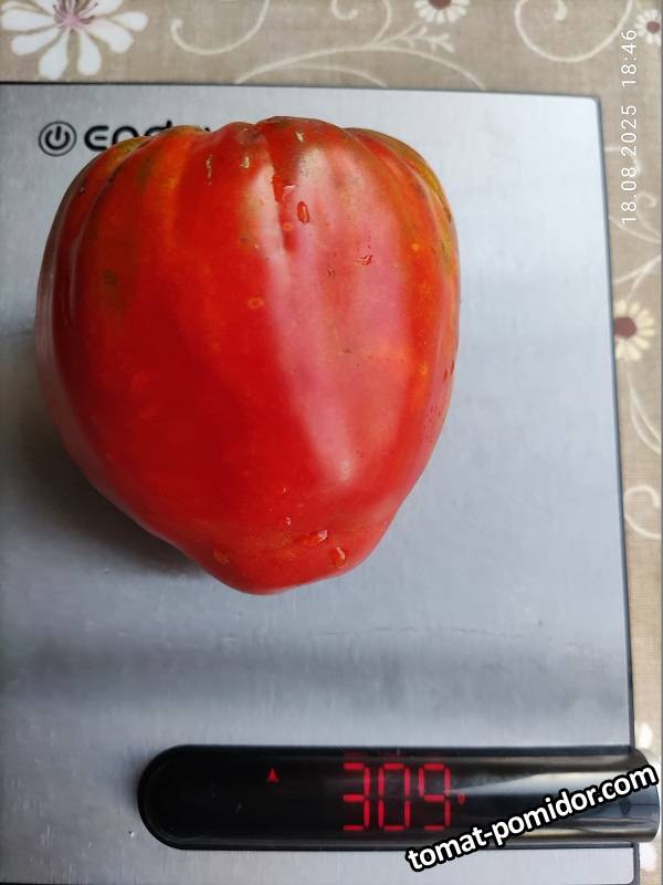 Индет. 2 м., среднеспелый. Очень крупные плоды 300- 500 гр., отдельные весом более 1,5 кг. Плоды широкосердцевидные, иногда с чуть заметными гранями, насыщенного красного цвета. Мякоть плотная, очень ароматная, малосемянная. Вкус превосходный, насыщенный, сладкий, мясистые.