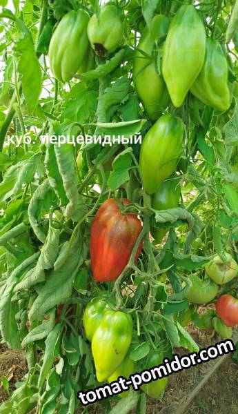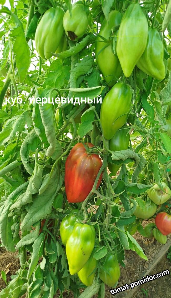 Кубинский перцевидный - индет. Урожайный сорт, плоды могут достигать 300 гр. Мякоть практически без жидкости, но не грубая. Сорт хорошо использовать на вяление - и суховатые, и шкурка тоненькая. А также на салаты, пасту. Из недостатков - иногда подвержен вершинке, поды легко отделяются от плодоножки.