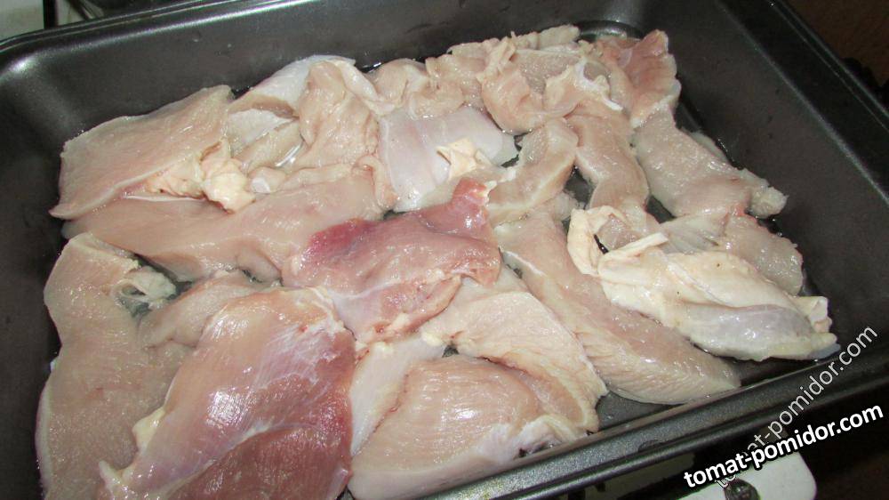 Нарезаем стейки из курочки солим, перчим и на противень