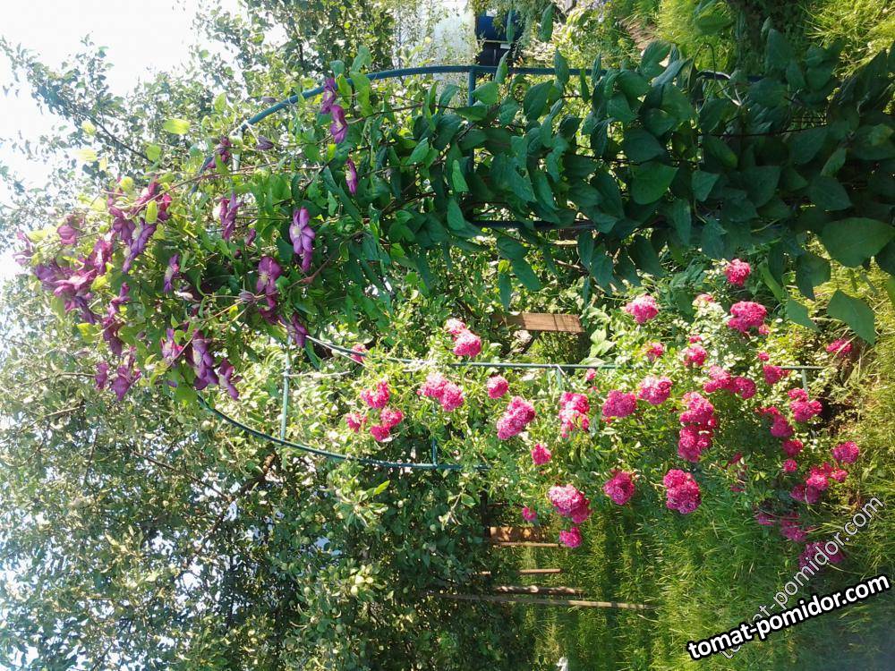 роза Эксцельза-навстречу клематису Виль де Лиону
