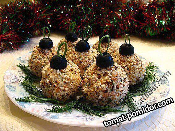Закуска "Елочные шары" Ингредиенты: филе куриной грудки - 300 гр., сыр – 200 гр., зелень, грецкие орехи – горсть, чеснок (по желанию), майонез (или другой соус по желанию), оливки. Способ приготовления 1. Филе куриной грудки отвариваем в подсоленой воде (15-20 минут) и мелко нарезаем. Сыр трем на мелкой терке. Зелень мелко режем. Грецкие орехи измельчаем. Добавляем раздавленный чеснок. Просто смешиваем все компоненты и заправляем майонезом. 2. Скатываем из полученной массы шарики. Обваливаем в ореховой крошке, из половинок оливок делаем «крепления», из зелени — петельки.