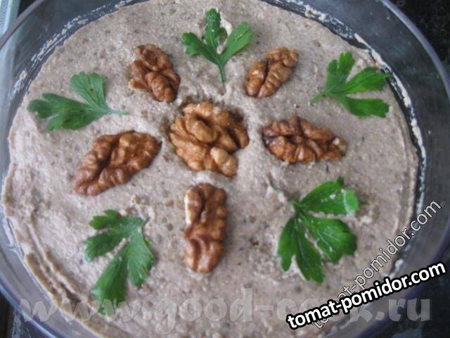 Закуска из печеных баклажанов, грецких орехов с чесноком и оливковым маслом