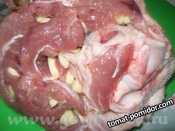 Свиная рулька, запеченная с чесноком и соусом типа " ткемали"