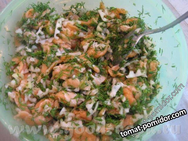 Слоеные пирожки с семгой, луком и укропом