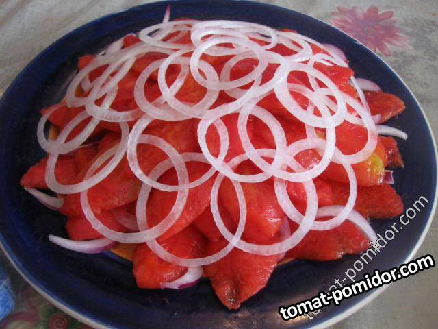 Маринованная закуска из помидоров с луком и оливками