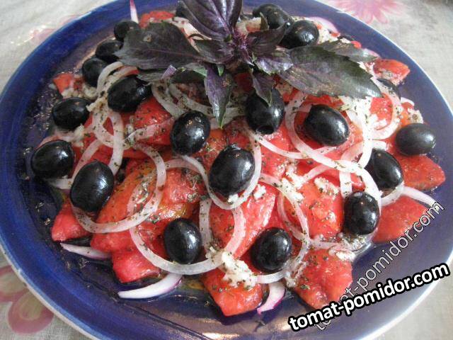 Маринованная закуска из помидоров с луком и оливками