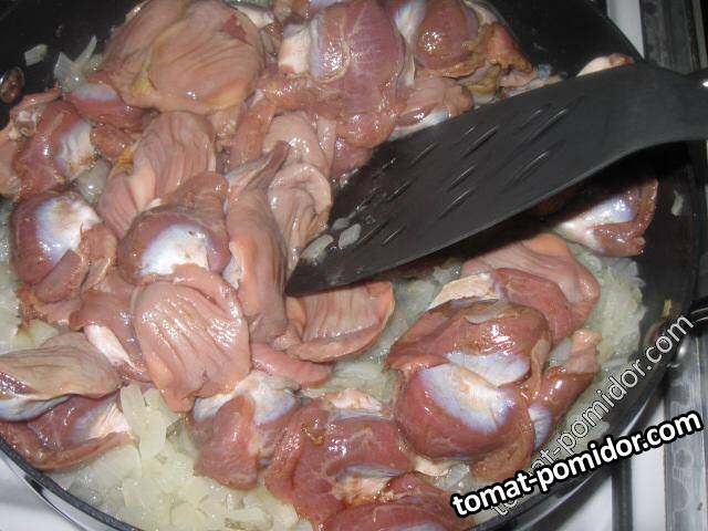 Куриные желудочки, тушеные с луком, кари и орегано.