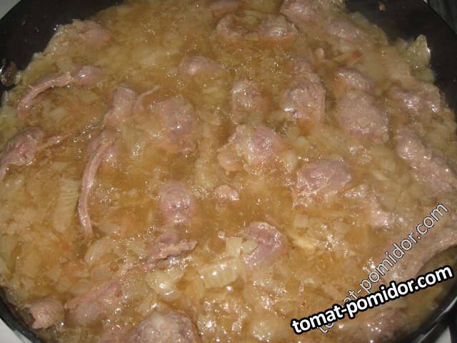 Куриные желудочки, тушеные с луком, кари и орегано.