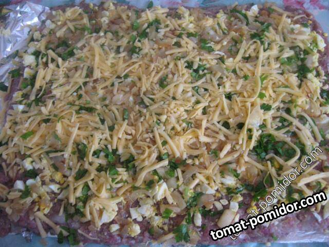 Запеченный батон из фарша, с начинкой из яиц, лука,яблок и сыра