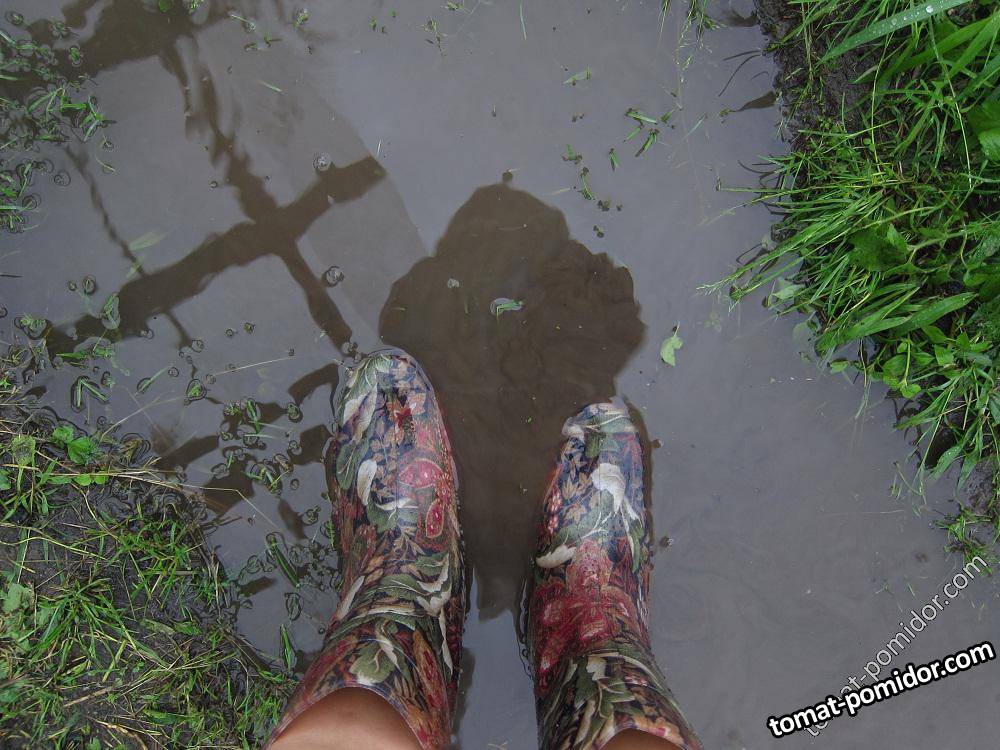 мои ноги в луже между грядками