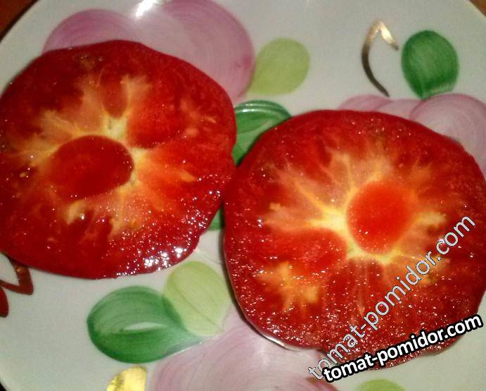 От себя бы добавила, что цвет у плодов очень красивый, необычный, темно розовый. Плоды сочные,в середине лета были с очень насыщенным настоящим помидорным вкусом со сладостью. Под конец осени вкус, конечно, поменялся, думаю, причина в том, что я забросила все подкормки. Первые плоды имели трещины на нижней части плода, последующие пошли ровные. Урожайностью очень порадовал.