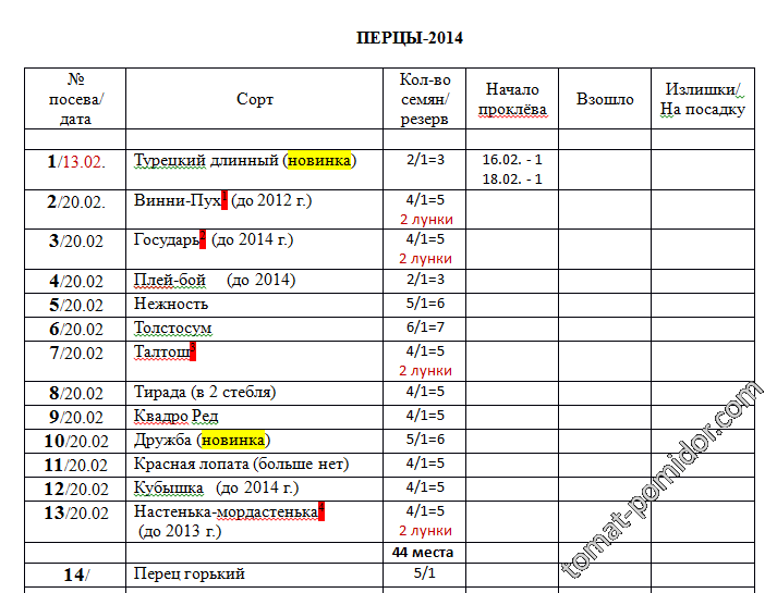 Перец - список на посадку