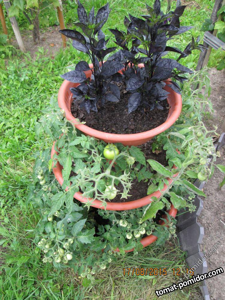 На нижнем этаже - томат Micro Tom, на втором - томат Patio Totem, на третьем - декоративный перец.