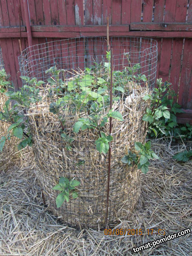 Я выращиваю картофель в картофельных башнях, сделанных из сетки и соломы. У меня получается 3-4 слоя земли с посаженной картошкой, проложенные между собой соломой. Побеги пробиваются через солому и сетку вбок. Наверх я сажаю фасоль.