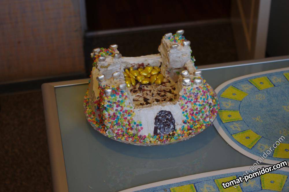 Каждый Новый год я пеку торт по одному и тому же рецепту. Тесто с добавлением мёда, крем сметанный. Это наш любимый торт, его едят все в нашей семье. Только оформление торта всегда разное, в зависимости от того, год какого животного наступает. Из-за этого торты выглядят настолько по-разному, что кажется, что и рецепты разные. Этот замок я сотворила на год дракона. Внутрь я поместила купленного сахарного дракончика. Но на фото его нет.