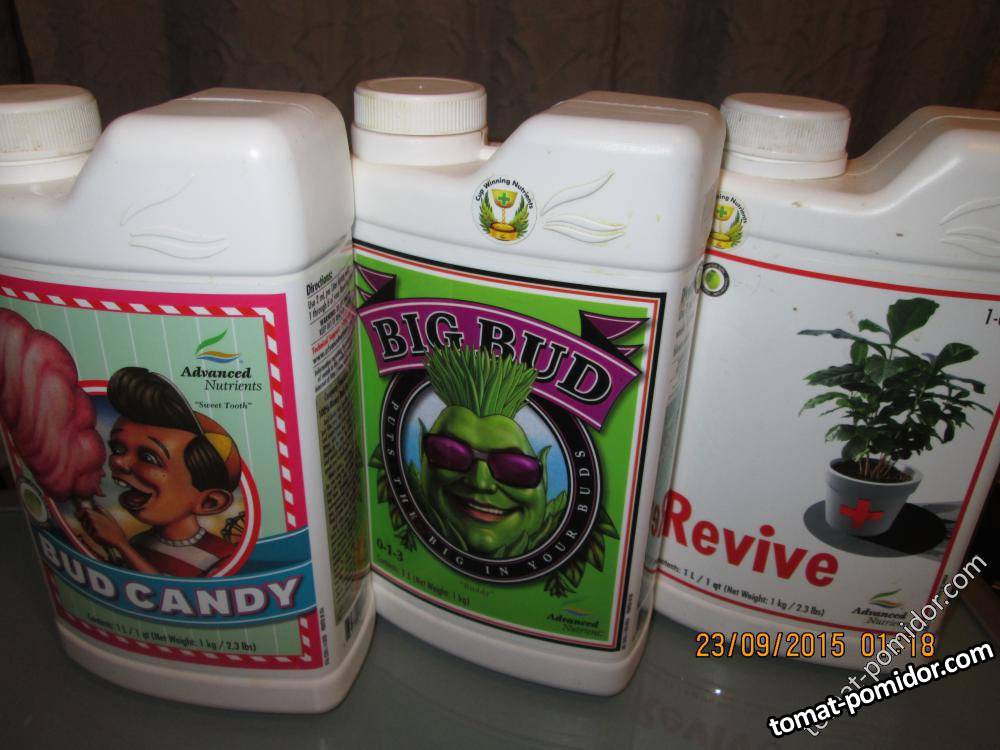 Слева - для придания сладости плоду (использую для арбузов), посередине - подкормка томатов: почти вся таблица Менделеева, справа - реаниматор для загибающихся растений.