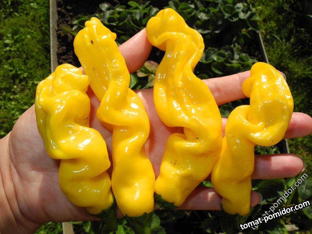 Желтая разновидность скандально известного сорта острого перца. Сорт известен тем, что некоторые плоды могут иметь весьма натуралистическую фаллическую форму. Но большинство стручков имеет просто замысловатую форму. Острота до 50 000 сковиллов. Аромат и вкус классические, перечные. Срок вегетации 150–160 дней. Можно использовать в свежем виде и для консервирования. Но лучше всего подойдут для того, чтобы удивлять друзей и гостей. Наилучшие результаты получаются при выращивании в тепличных условиях. Можно выращивать в комнатных условиях в горшке от 3-х литров. При выращивании в грунте высота растения не превышает 50 см.