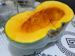 Пару дней назад, когда я проверяла свои тыквы, меня чем-то смутил хвостик маленького Фундучка. Я пристально его разглядывала, но придраться было не к чему. А сегодня из-под него уже потекло! И вокруг плодоножки тёмное мягкое пятно. Я разрезала, и удивлению моему не было предела - он был весь мягкий, т.е. проморожен насквозь! Пятно гнили при этом было совсем небольшое, хотя вся мякоть мягкая. Как он столько пролежал?? В общем, не бейте меня, но половину я выкинула, очень уж неприятная консистенция у размороженной мякоти. Но вторая половина помясистее и не такая мягкая, бледно-жёлтая и ооочень с -